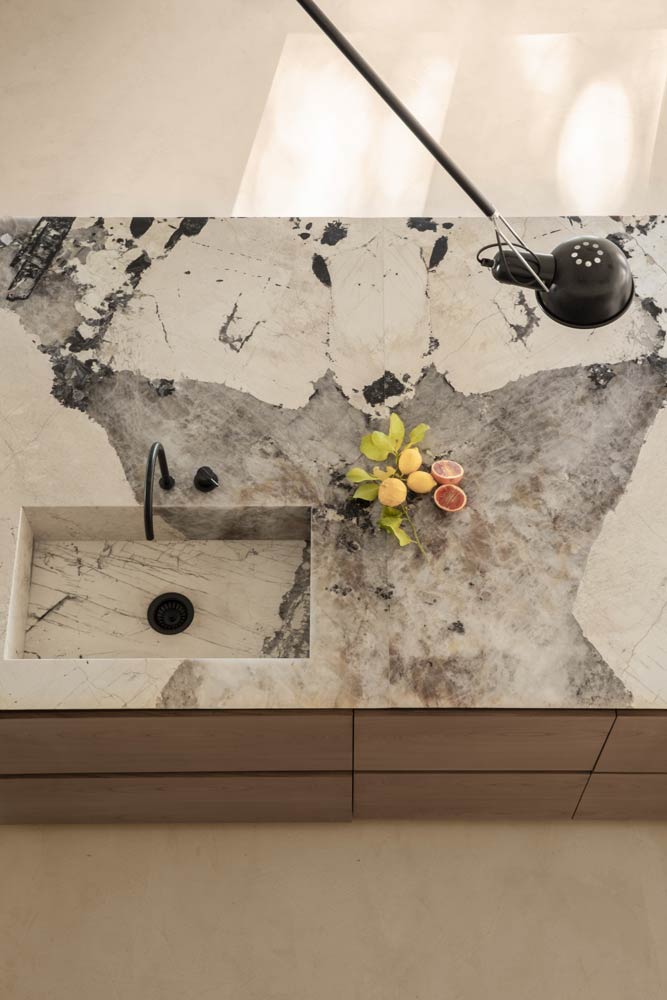 Specifically, the project involved the research and selection of numerous materials, including a distinctive Brazilian granite, seamless surfaces, and handmade terracotta—resulting in a fully custom-made supply.