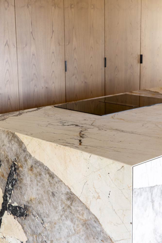 The choice to make the kitchen countertop in Patagonia is striking: the eye is drawn to its chaotic soul, created by the interplay of light between the natural marble-like section and the glossy quartzite part. You can easily get lost in the infinite hues, letting your imagination run wild with the slabs cut and arranged in an open pattern. The range of colors and patterns blends effortlessly with a wide variety of furniture and living styles, from modern to traditional. Due to its fluid and at times elusive color variations, it adds a touch of surprise to each space, creating a visual impact akin to that of a work of art. Among its qualities, the longevity of this material stands out, as it can withstand the test of time while maintaining its natural beauty. Additionally, its exceptional resistance to scratches, chips, impacts, and acids makes it the ideal choice for high-traffic areas, such as kitchen countertops.
